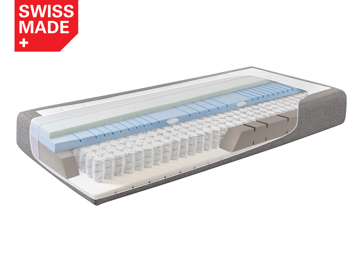 Die 7-Zonen Taschenfederkern-Matratze Christa Spring-Tex ist die hochwertigste Matratze aus dem Hasena Sortiment und steht für höchsten Schlafkomfort. Mit einer Höhe von 24 cm bietet sie eine solide Basis für erholsame Nächte. Kernstück ist die Angelpearl-Schaumplatte, ein besonders elastischer Schaum mit offenporiger Struktur, der sich sanft anpasst, Druck gleichmässig verteilt und eine hervorragende Luftzirkulation ermöglicht. So entsteht ein komfortables und gesundes Schlafklima. Bezogen im identischen Stoff wie das Bett, fügt sich die Christa Spring-Tex harmonisch ins Gesamtbild ein. Swiss Made – die Matratze wird in der Schweiz gefertigt.