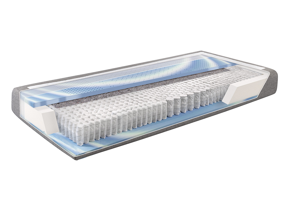 Die 7-Zonen Taschenfederkern-Matratze Elena Spring-Tex überzeugt mit solider Qualität und ausgewogenem Liegekomfort. Mit einer Höhe von 20 cm passt sie sich dank der hohen Auflösung der Federkerne optimal an den Körper an und verteilt den Druck gleichmässig. Zusätzlicher Support im Lordosenbereich fördert eine ergonomische Liegeposition. Eine gebohrte Geleffekt-Abdeckung unterstützt die Klimatisierung, verbessert das Liegeempfinden und sorgt zusammen mit der offenporigen Struktur für ein ideales Bettklima. Bezogen im identischen Stoff wie das Bett, fügt sie sich harmonisch ins Gesamtbild ein.